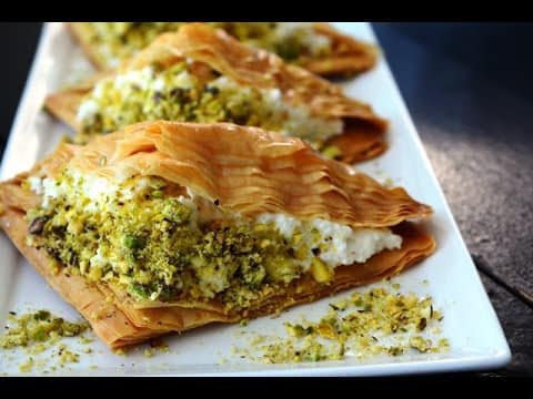 Pâte phyllo, beurre, crème, sucre et pistache.